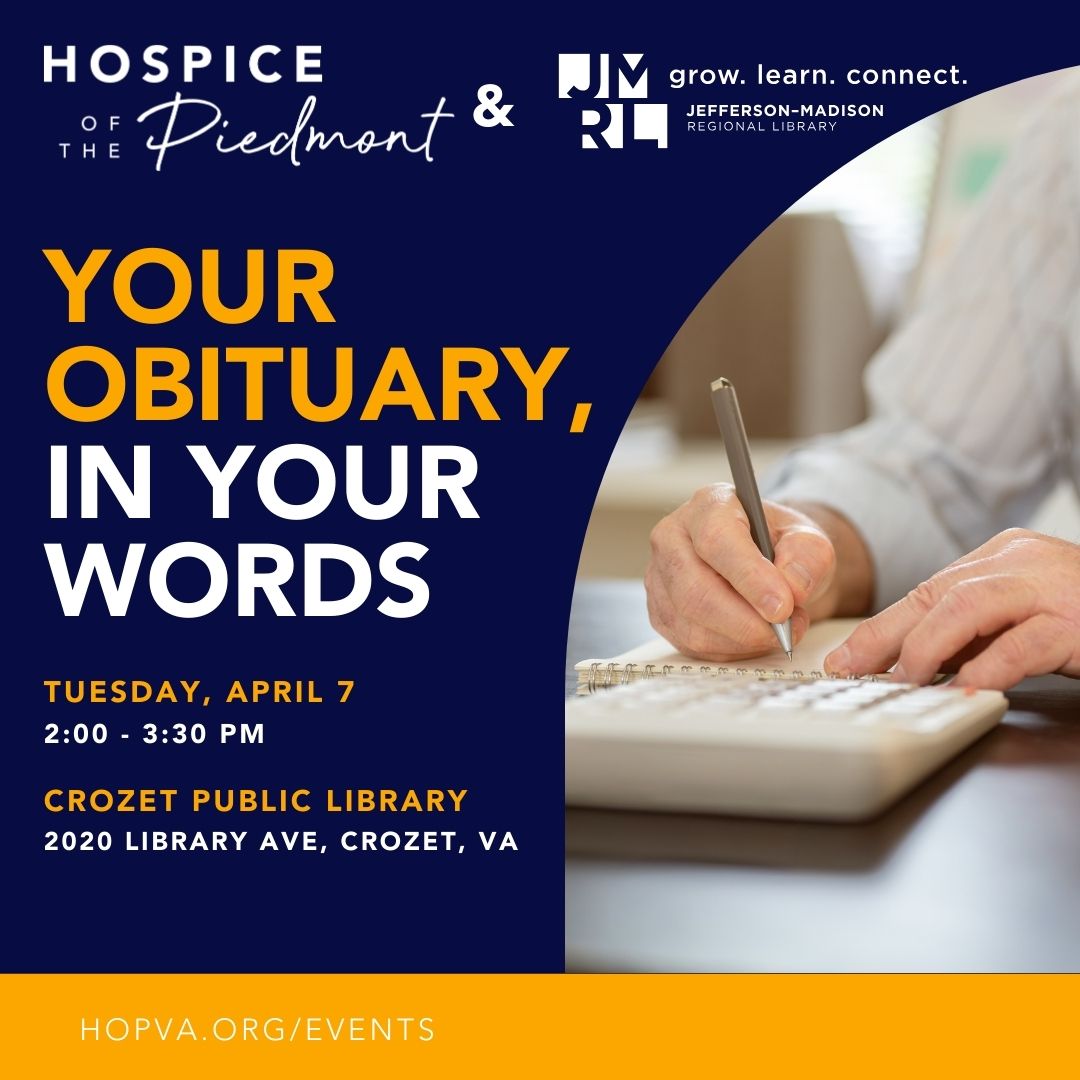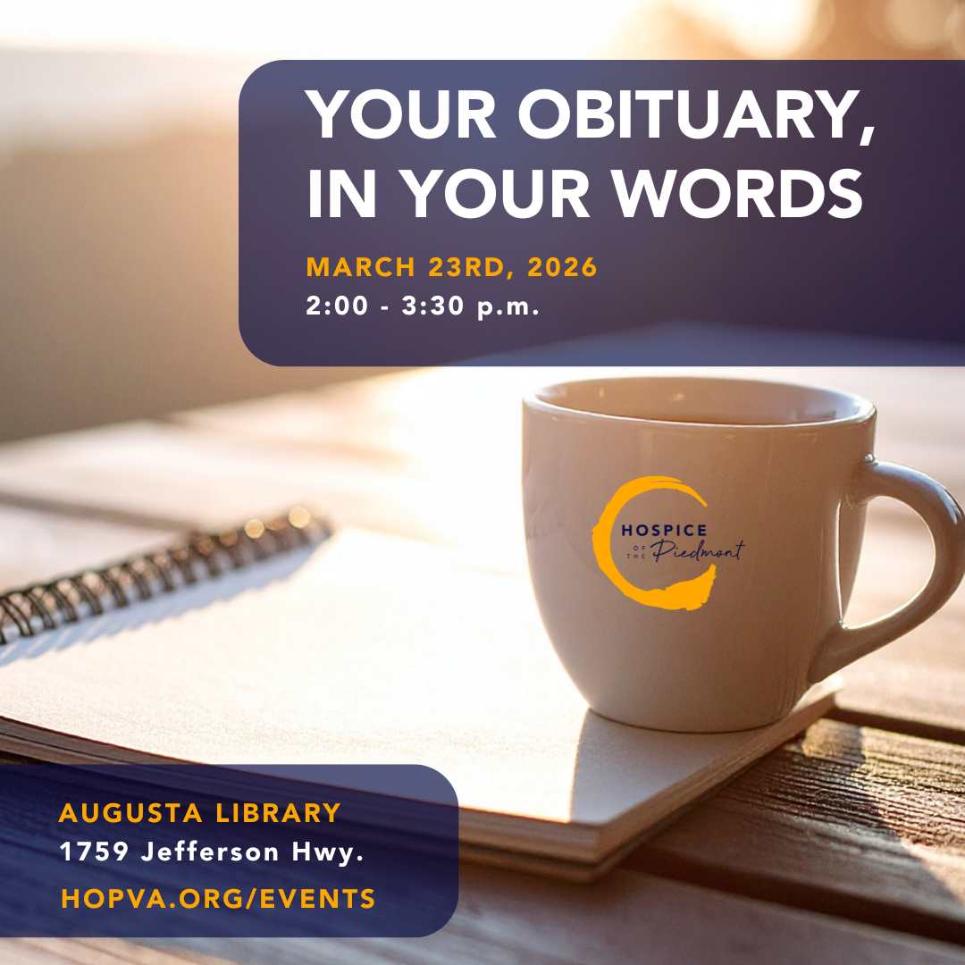 Discover what that means in Hospice of the Piedmont’s Obituary Writing Workshop. Through guided reflection, discussion, and writing prompts, participants will explore how to shape an obituary that reflects what truly matters to them. Together, we’ll consider questions of purpose, audience, and tone; gather the essential facts of a life; and review examples ranging from straightforward to warm or even humorous.