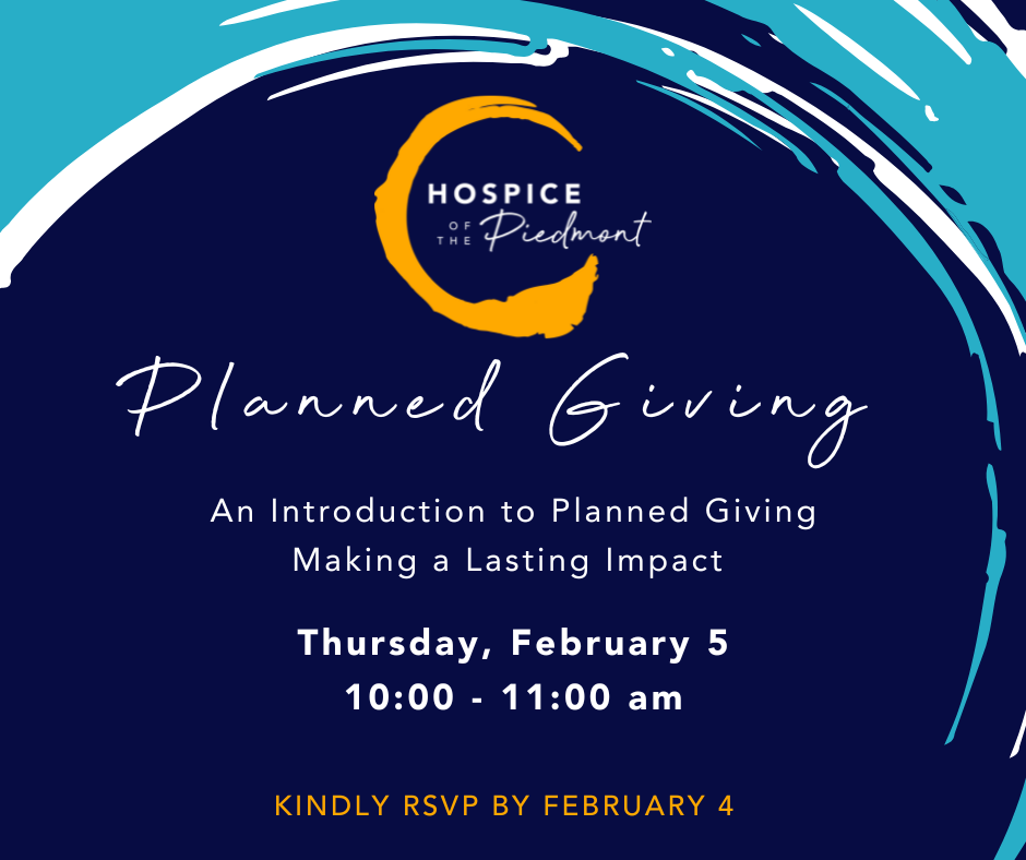 Join us for an informative session with Julie King, Esq., Hospice of the Piedmont Board Member and experienced estate attorney, as she walks through the process of making a lasting impact through Planned Giving.